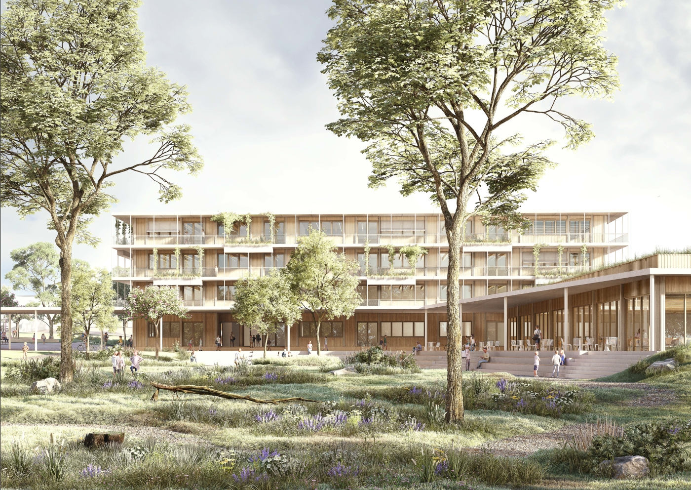 Der erste Preis des Wettbewerbs geht an das Architekturbüro KUBUS360 GmbH und Ackermann + Renner Architekten GmbH BDA aus Stuttgart in Zusammenarbeit mit den Landschaftsarchitekten BASE Landschaftsarchitekten PartGmbB aus Berlin. Der Entwurf überzeugte das Fach- und Sachpreisgericht unter Vorsitz von Professorin Hilde Léon (Berlin) durch seine klare Architektur, die lichtdurchfluteten und gut strukturierten Räume sowie ein nachhaltiges Konzept, das auf Holzbau und Begrünung setzt. Diese Elemente ermöglichen nicht nur eine hohe Energieeffizienz, sondern schaffen auch eine Lernumgebung, die sowohl den pädagogischen Anforderungen als auch dem Wohlbefinden der Schülerinnen und Schüler gerecht wird.