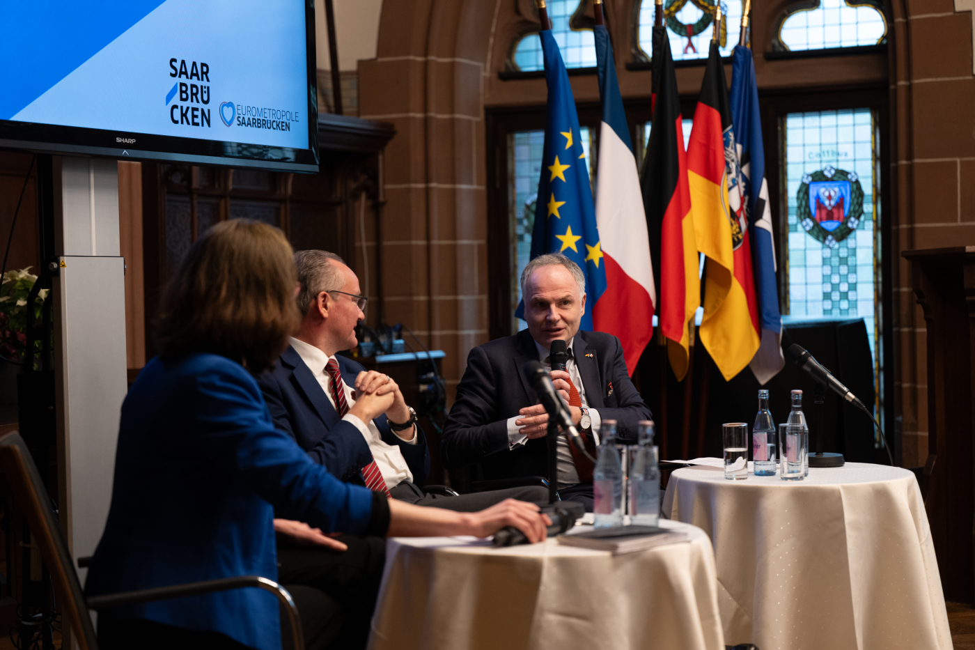Über zentrale Zukunftsfragen Europas sprach der Oberbürgermeister mit dem Staatsminister für Europa, Gunther Krichbaum, und dem französischen Generalkonsul für das Saarland, Jérôme Spinoza, in einer Podiumsdiskussion. Themen waren unter anderem die Glaubwürdigkeit europäischer Abschreckung, Blockaden bei gemeinsamen Rüstungs- und Industrieprojekten sowie unterschiedliche strategische Herangehensweisen in Deutschland und Frankreich. Einigkeit bestand darüber, dass ohne konkrete Fortschritte in der deutsch-französischen Zusammenarbeit die europäische Sicherheits- und Verteidigungspolitik nicht gelingen kann.