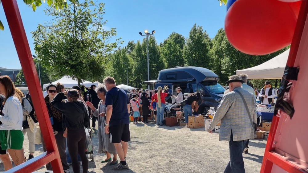 Superbrücken – Das Modellvorhaben zur Weiterentwicklung der Städtebauförderung präsentiert sich mitten im eigenen Projektgebiet: dem Bürgerpark Hafeninsel. Als Teil des lebendigen Flohmarkts ist das Modellvorhaben an den bunten Bauzaun-Bannern zu erkennen.